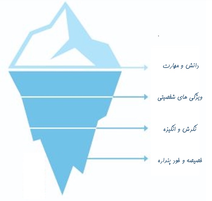 ویژگیهای شخصی زیادی وجود دارند که بر مهارتها، دانش، نقش اجتماعی، تصور از خود، ویژگیها و انگیزههای ما تاثیر میگذارند. این ویژگیهای مختلف در سطوح مختلف آگاهی وجود دارند. ما میتوانیم این ویژگیها را سطوح مختلف یک کوه یخی بدانیم. آگاهانه ترین آنها مواردی هستند که بالای آب بر روی نوک قابل رویت کوه یخی قرار دارند در حالی که ویژگیهایی که کمتر آگاهانه و یا ناخودآگاه هستند زیر آب، در بخش پایینی کوه یخی قرار دارند. ویژگیهایی که بیش از همه از آنها آگاهی دارید، دانش و مهارتهای شما هستند که به عنوان نوک کوه یخی به تصویر کشیده میشوند. مهارتها نشاندهنده این هستند که شما چه کاری میتوانید انجام دهید و چه دانشی دارید، مانند تجربه شما از چیزها و موقعیتها.